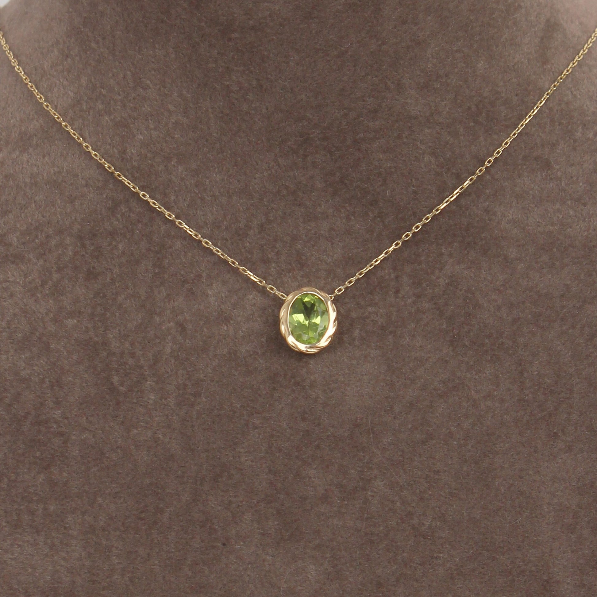 This necklace is crafted in solid 14K gold and features a 5×7 mm natural oval-cut peridot, set in a smooth bezel pendant design. Available in yellow, white, and rose gold, it is a durable and precise piece made for everyday wear.